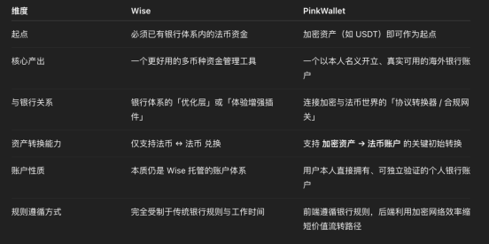 那 PinkWallet 至少提供了一条Wise 无法覆盖的路径。它并不替代 Wise,而是解决了 Wise 永远解决不了的那一段:加密资产 → 可用法币账户。